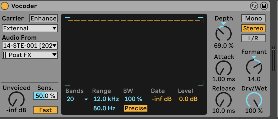 - Formant: This controls whether the effect emphasizes lower or higher frequencies. I adjusted this parameter depending on the characteristics of the sound I used as the carrier.