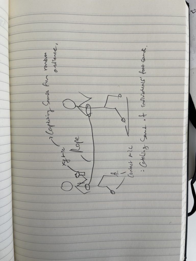There was an idea I had during my first year that I never tried out: tying two people together with a rope and having them walk around. This idea came from an experience I had when I visited a gallery in Korea with a friend. At that time, I found the crossing sounds of footsteps quite interesting, which led me to think of this concept. Initially, the reason for using the rope was to record those footstep sounds from the center between the two people by tying them together and suspending a microphone in the middle. However, as I expanded the idea, it evolved beyond sound into a performance piece itself.