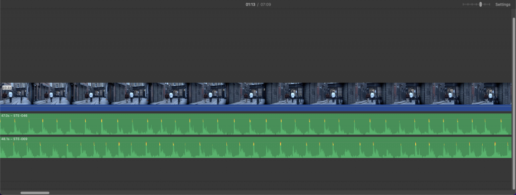 Another issue was that the latter part of the microphone recording was unusable. I hadn’t monitored the recording with headphones during the shoot, which resulted in serious problems. The mic wasn’t properly attached to my foot in the later recordings, so it failed to capture the sound of my steps and recorded mostly noise instead. I had to re-record many of those parts. Also, I didn’t keep notes on which recordings corresponded to which videos, so finding the right audio files became time-consuming and tedious.