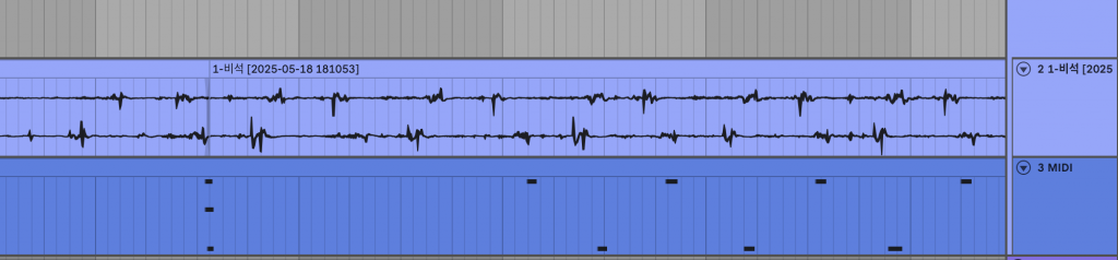 My syncing process involved placing the video and the corresponding audio file together in the editing software, amplifying the audio waveforms to make them visible, and marking the visual moment when a foot hits the ground. I then aligned that moment with the peak of the waveform. Initially, I had tried a different method: watching the video while using MIDI triggers in Ableton Live to mark each footstep in real-time. However, my reaction speed varied and the waveform itself often included noise or unclear foot-lift sounds, which made precise syncing difficult. I abandoned that approach. In retrospect, none of this would have been necessary had I included some form of slate during filming—but it’s a valuable lesson for future shoots.
