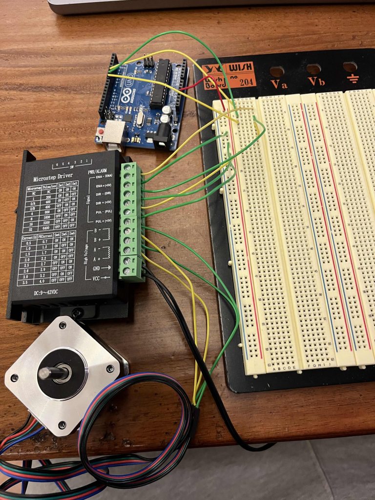 To use the driver’s DIR, PUL, and ENA pins, separate power needed to be supplied, and they had to be used in a pull-up configuration. So, I supplied power using the Arduino’s 5V pin, and the motor’s power was supplied through a power adapter. The code was set to make the motor rotate in the forward direction for 6400 steps, and then rotate in the reverse direction for another 6400 steps.